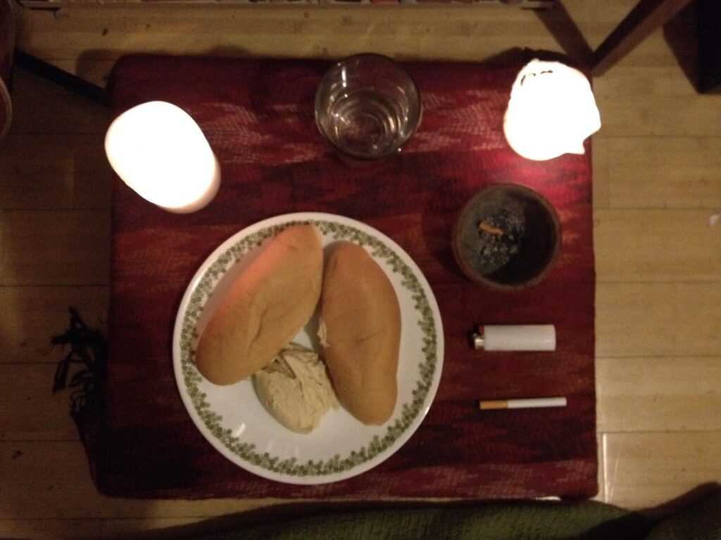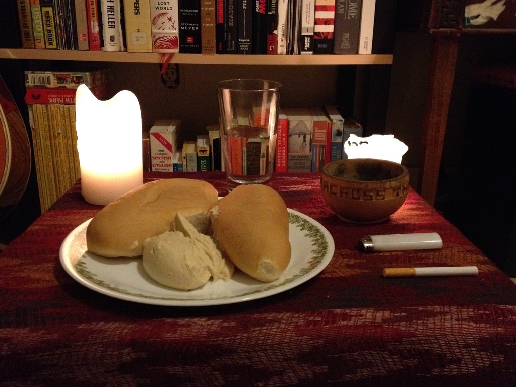 A poor artist’s meal of water, bolillos, hummus, and one last cigarette.