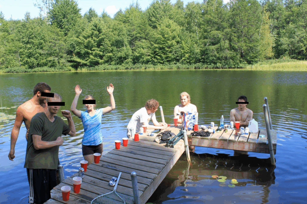 A friendly game of flip-cup, in the river, among high school friends.